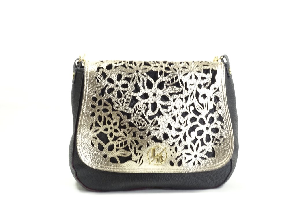Dámská kabelka přes rameno se uzavírá na zip a má klopu na magnet s květinovým motivem ve zlatém barevném provedení.