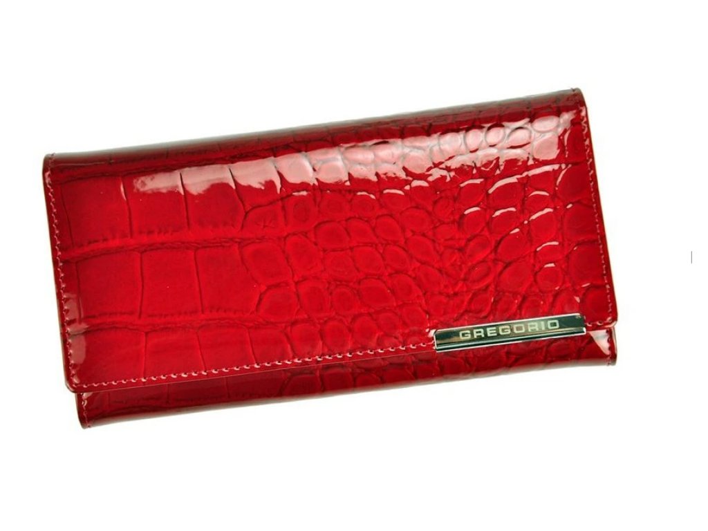 Peněženka značky Gregorio se uzavírá na patentek, povrch peněženky je lesklý, hladký a je strukturován do hadí kůže.
