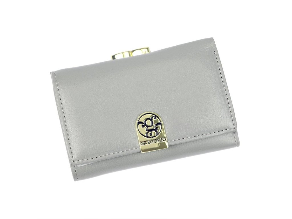 Kožená dámská šedá pevná peněženka značky Gregorio o rozměrech cca 12 x 8 cm, která se uzavírá na patentek.