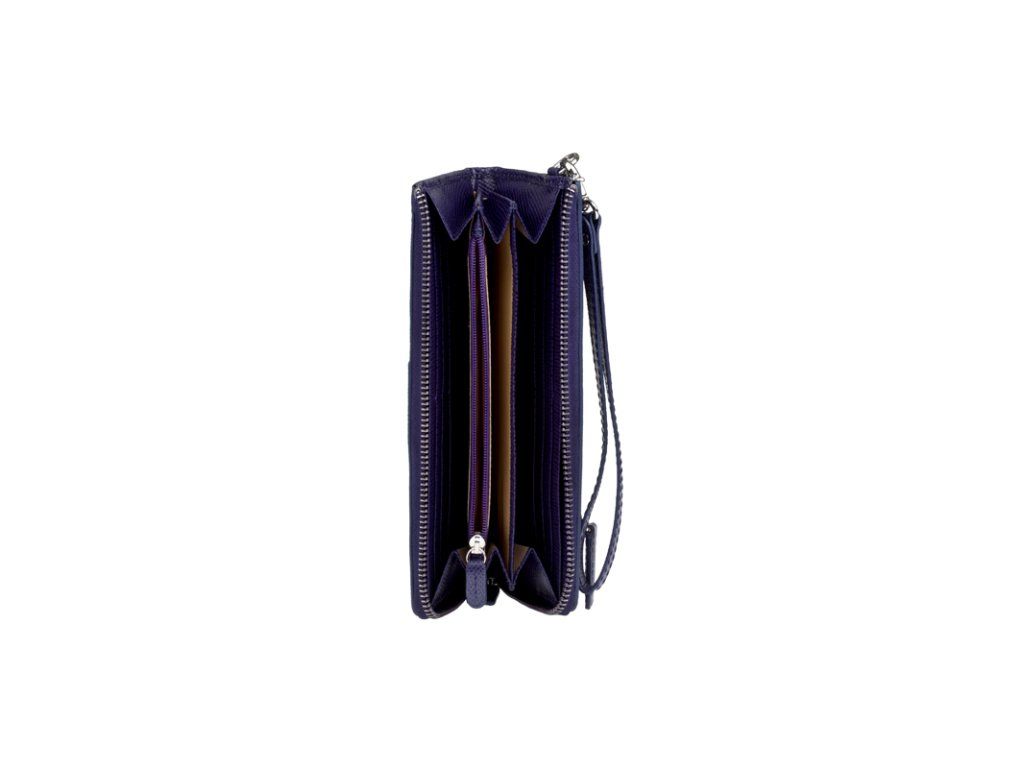 Uvnitř obsahuje fochy na papírové bankovky, přihrádky na karty, doklady a zipově uzavíratelný mincovník na drobné.