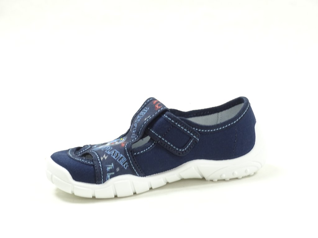 Chlapecké papučky s jednoduchým upínacím páskem na suchý zip.