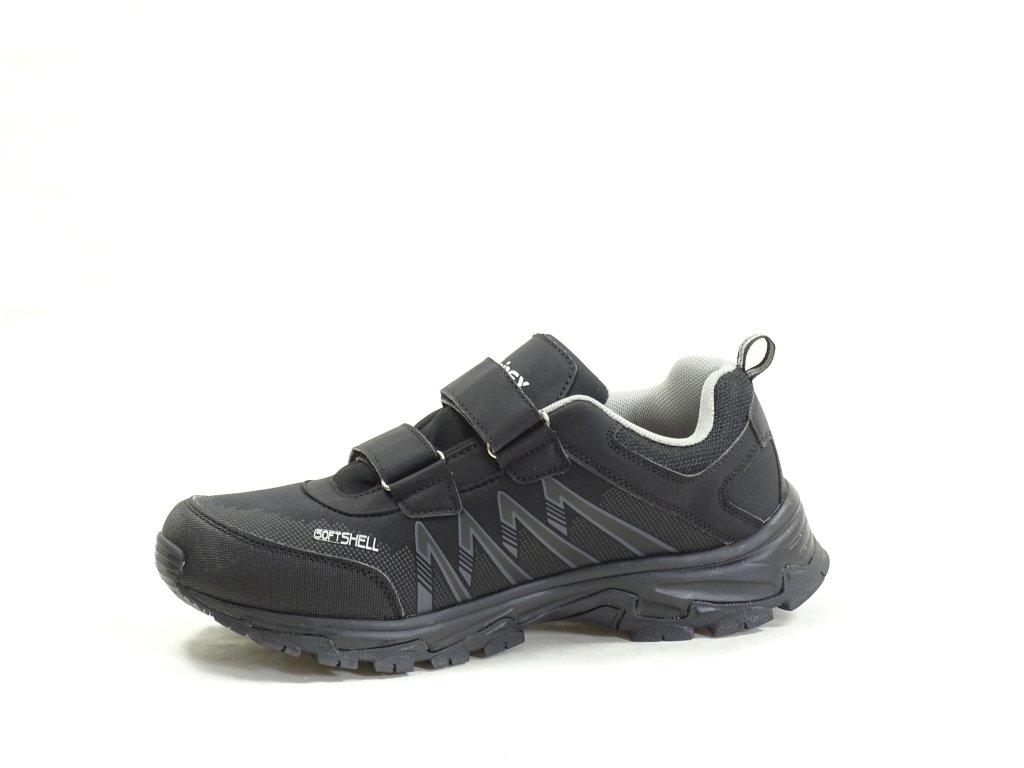 Tato sportovní pánská obuv je ideální volbou pro každodenní nošení i aktivní životní styl, díky nepromokavému softshellovému materiálu, který je lehký, pružný a prodyšný. Praktické zapínání na suchý zip a vypolstrovaná oblast kolem kotníku zajišťují pohodlí a stabilitu při každém kroku. Trendy černý design a masivní podrážka s výrazným vzorkem poslouží nejen v městském prostředí, ale i na výletech do přírody.