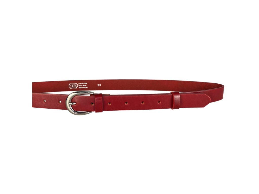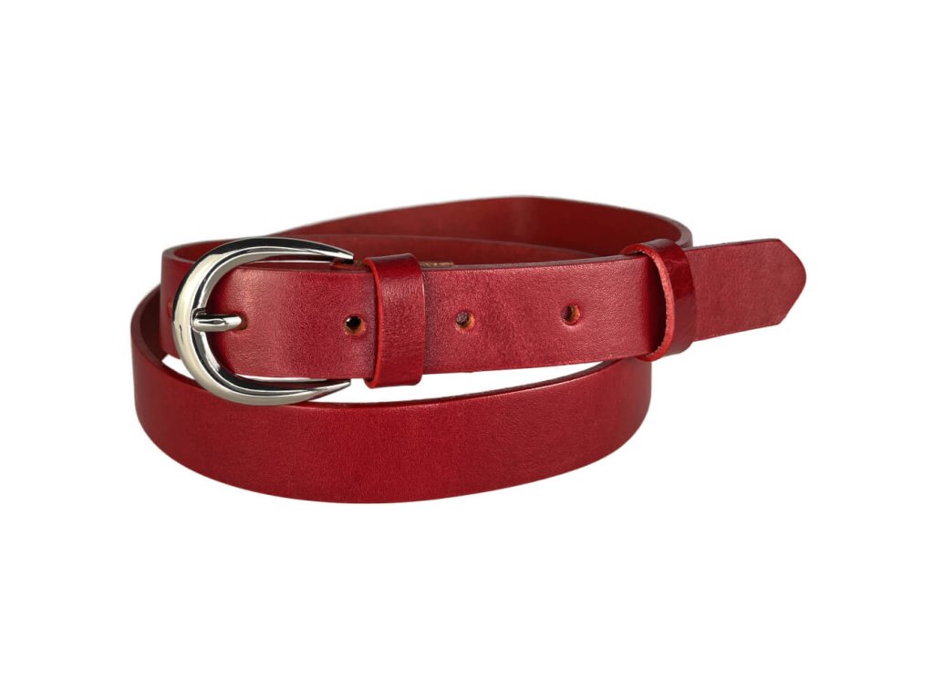Červený dámský kožený opasek o šířce 25 mm má pěknou decentní sponu s povrchovou úpravou NKS (nikl satinato).
