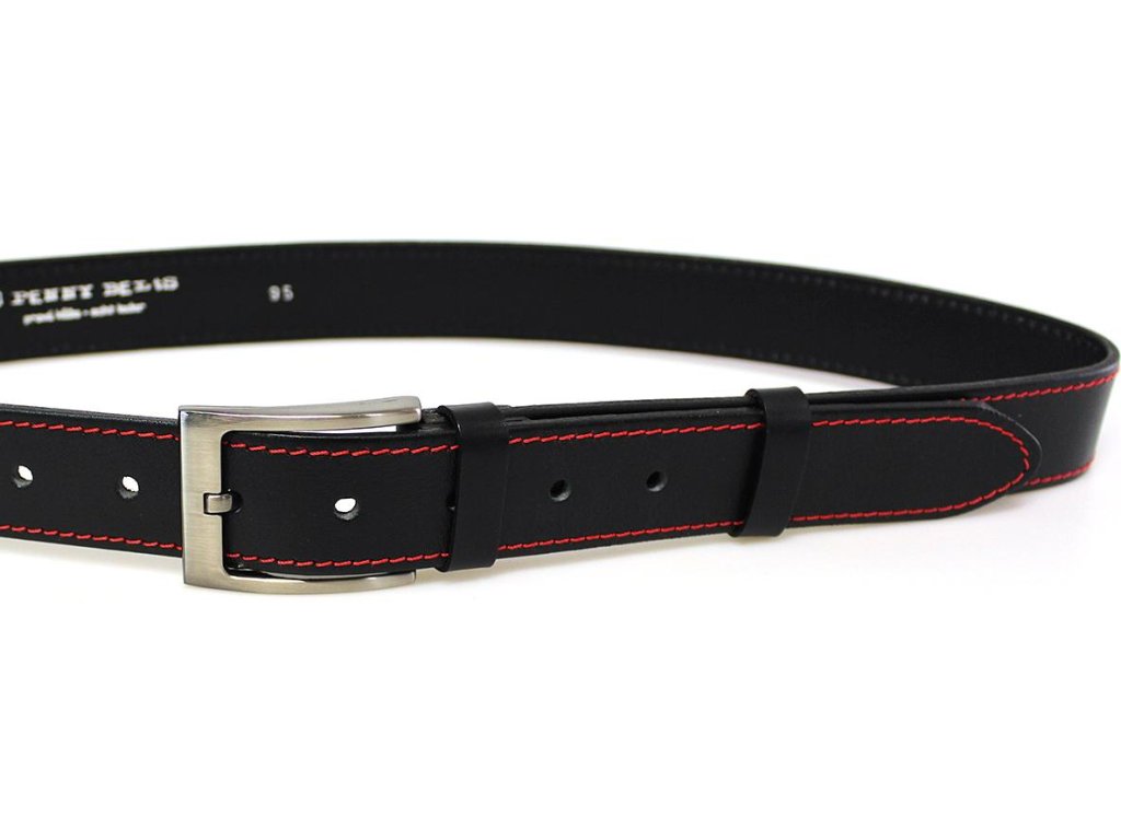 Pásek je vyrobený z černé usně, která je prošitá kontrastní červenou nití.