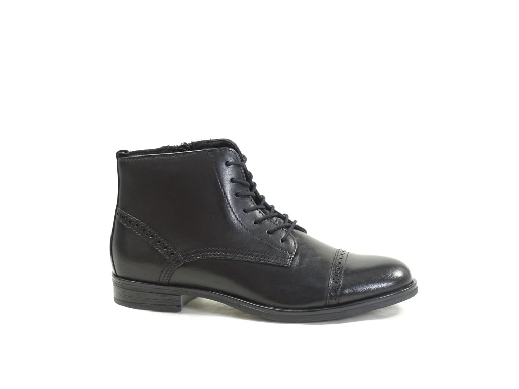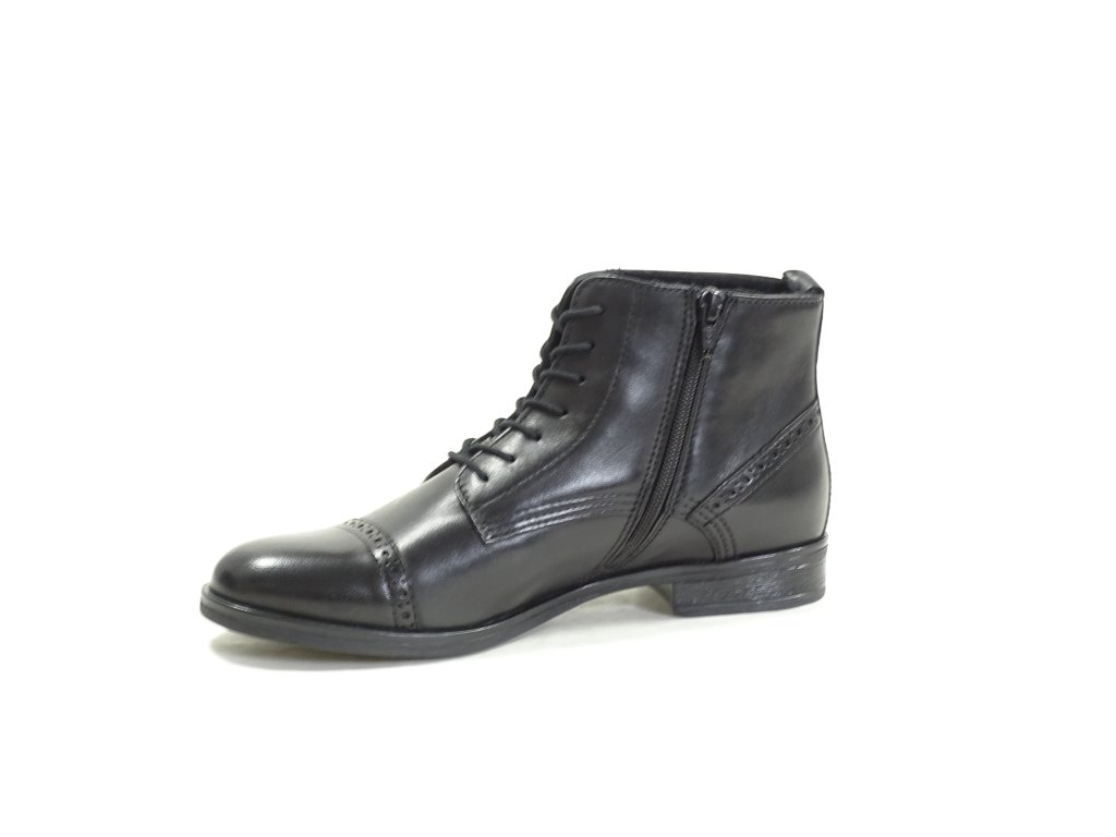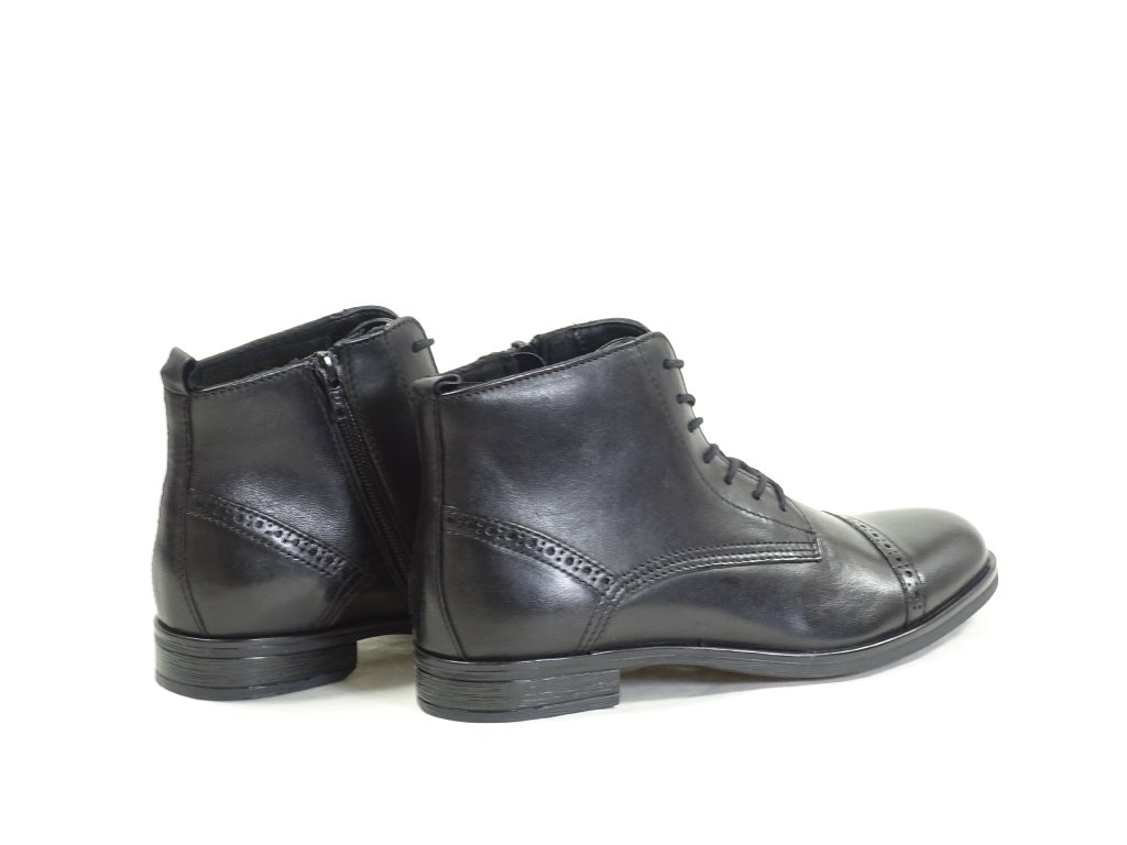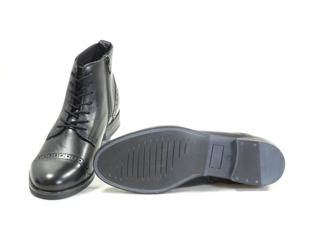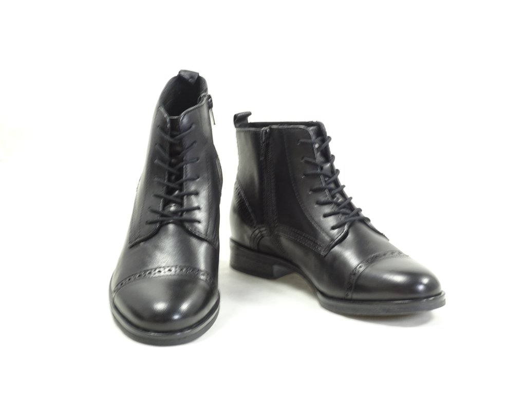 Elegantní dámské boty z kolekce obuvi Quo Vadis představují spojení stylu a praktického designu. Jsou vyrobeny z kvalitní černé usně, jejich lehce zateplená podšívka vás zahřeje během chladnějších dní, zatímco šněrování a zip zajišťují snadné nazouvání. Nízký podpatek o výšce 2,5 cm spolu s jemně vzorovanou syntetickou podešví poskytují pohodlí a stabilitu, ideální pro každodenní nošení.