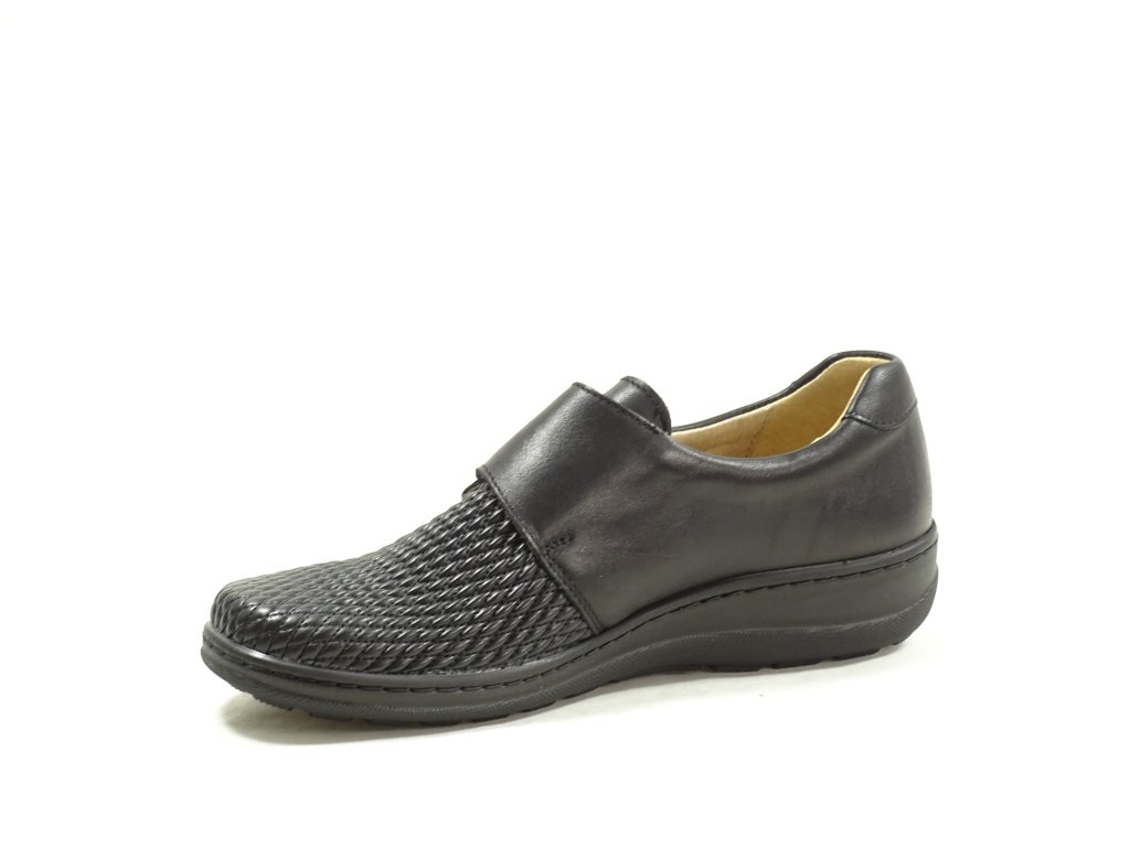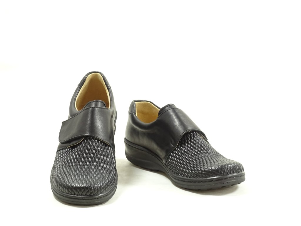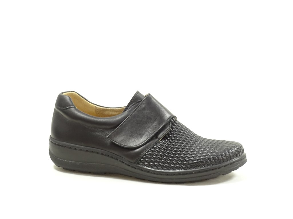 Dámská celoroční obuv z černé kůže nabízí elegantní řešení pro ženy upřednostňující zdravotní pohodlí a styl. Díky vyměkčené ortopedické stélce a koženému materiálu poskytuje tato obuv pohodlí i pro chodidla s Hallux Valgus nebo kladívkovými prsty, zatímco šíře G zajišťuje komfortní nošení. Praktické zapínání na suchý zip a pružný materiál v oblasti haluxu dělají z této obuvi ideální volbu pro každodenní nošení.