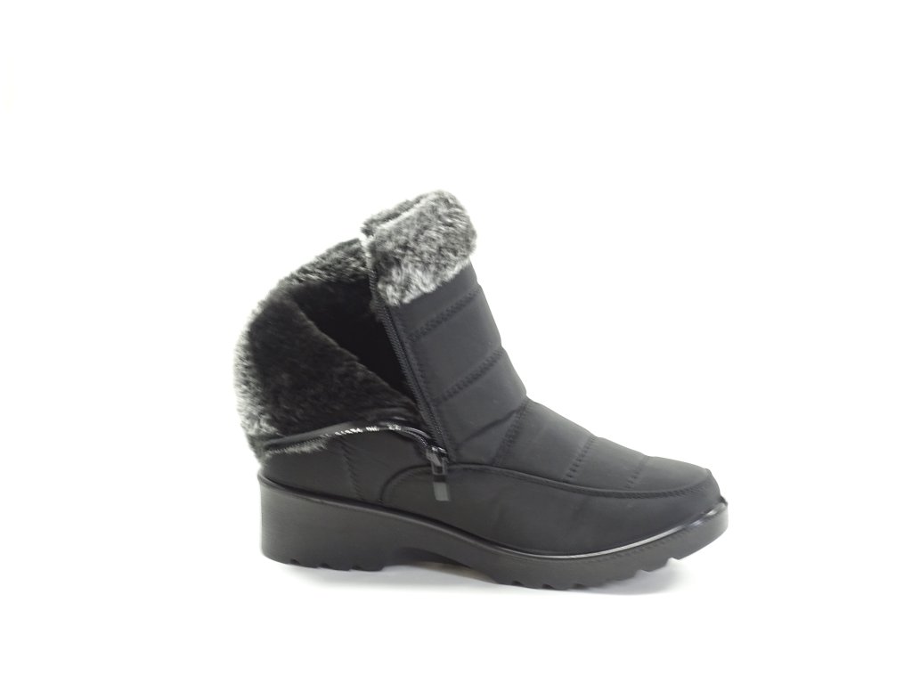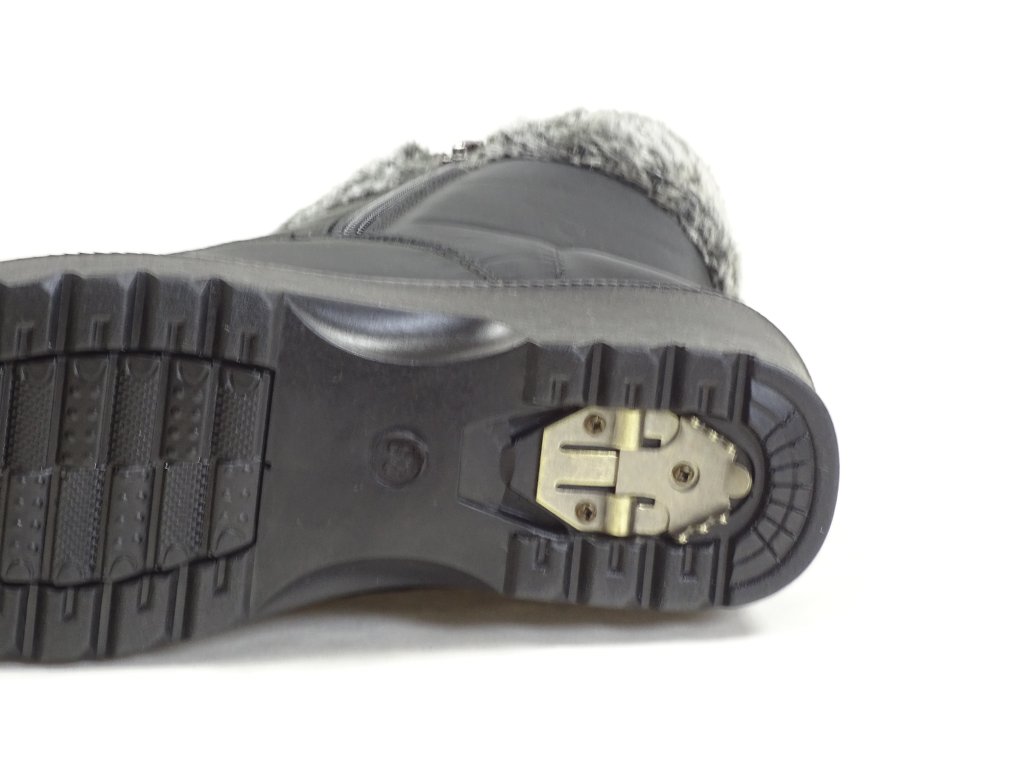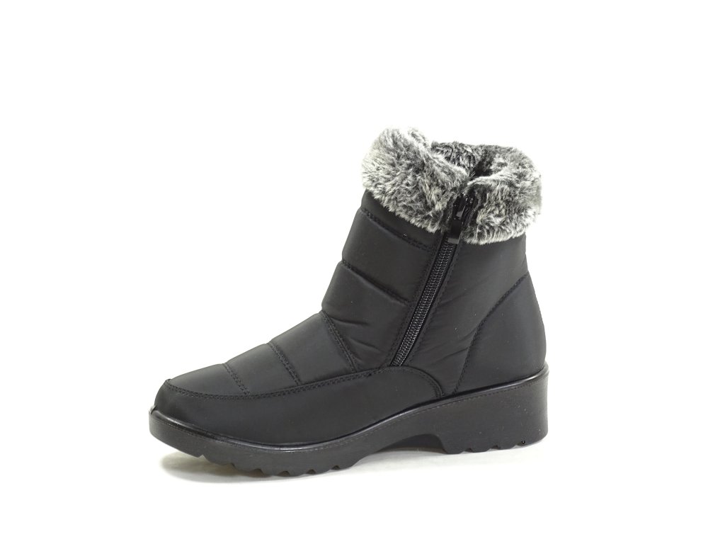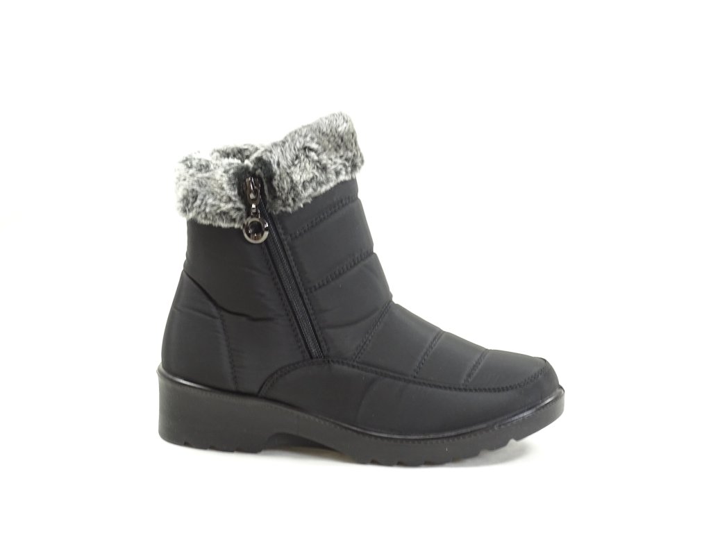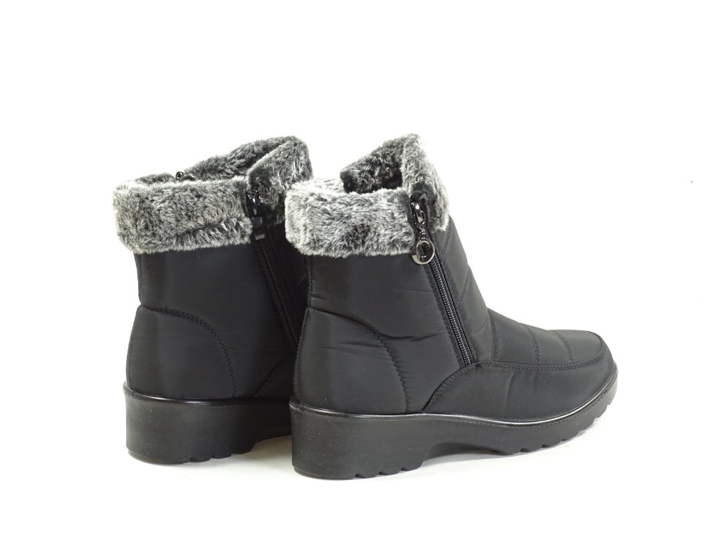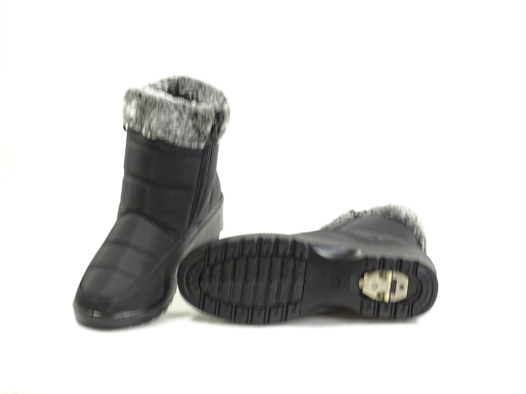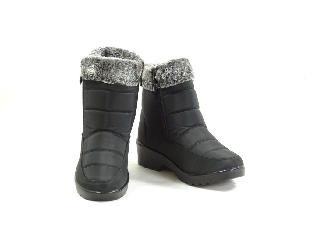 Dámské zimní sněhulky v černé barvě z kvalitního textilu s hřejivým kožíškem zajišťují teplo i ve chladném počasí. Stylový design s dekorativními zipy na obou stranách a jemným prošitím vytváří elegantní vzhled vhodný pro moderní ženu, která nechce slevit z pohodlí. Protiskluzová podešev s hroty v oblasti paty zabezpečuje stabilitu a bezpečnost na kluzkém povrchu, a to vše na klínku vysokém cca 4,5 cm.