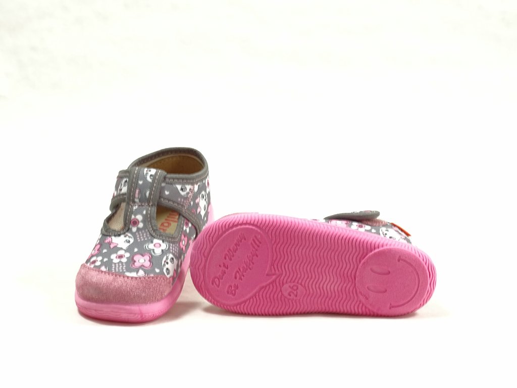 Nízké dětské bačkory v šedé barvě jsou vyrobeny z kvalitního textilu a jsou vybaveny praktickým zapínáním na suchý zip, což usnadňuje jejich nazouvání. Zdravotní vyjímatelná stélka s podporou podélné klenby pomáhá dětským nohám růst správně a v komfortu. Lehká a pružná podešev z přírodních materiálů zajišťuje pohodlí při každém kroku, zatímco módní design s okopem z broušené kůže dodává obuvi moderní vzhled.